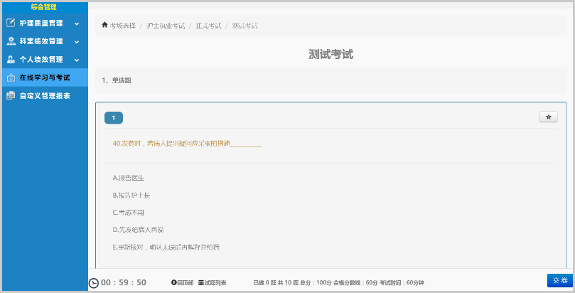 針對醫(yī)院等級評審和日常護理管理需要,護理在線學習與考試系統(tǒng),可以方便地完成全程在線學習、考試、統(tǒng)計以及持續(xù)跟蹤,試題設置、一鍵下發(fā),在線學習、省心省力。