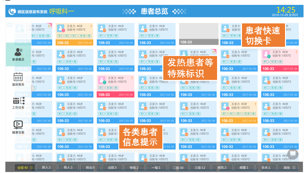 通過矩陣標(biāo)簽式患者視圖,概覽整個病區(qū)情況,并可以快速點(diǎn)選、交互查看不同類型患者信息,通過圖形化方式展現(xiàn)患者類型、出入院情況、基本信息、發(fā)燒情況、護(hù)理級別、病情危重程度等。