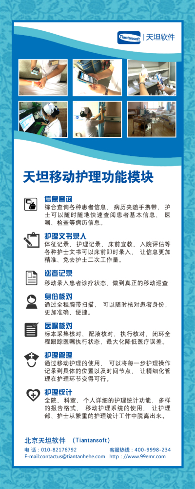 天坦移動護理系統(tǒng)改變傳統(tǒng)護理工作模式。將審藥、配藥、治療等環(huán)節(jié)實現(xiàn)移動化、條碼化、共享化。確保信息準確,用藥安全;系統(tǒng)將護理工作變得更方便、更自由,護士可以在任何地點調(diào)取病歷、化驗報告、檢查影像,利用各種移動終端完成醫(yī)囑執(zhí)行、床前護理文書錄入等護理操作,極大地減少護理管理人員的工作量,提高整個護理工作的工作效率與醫(yī)療質(zhì)量。