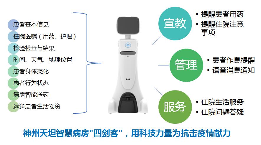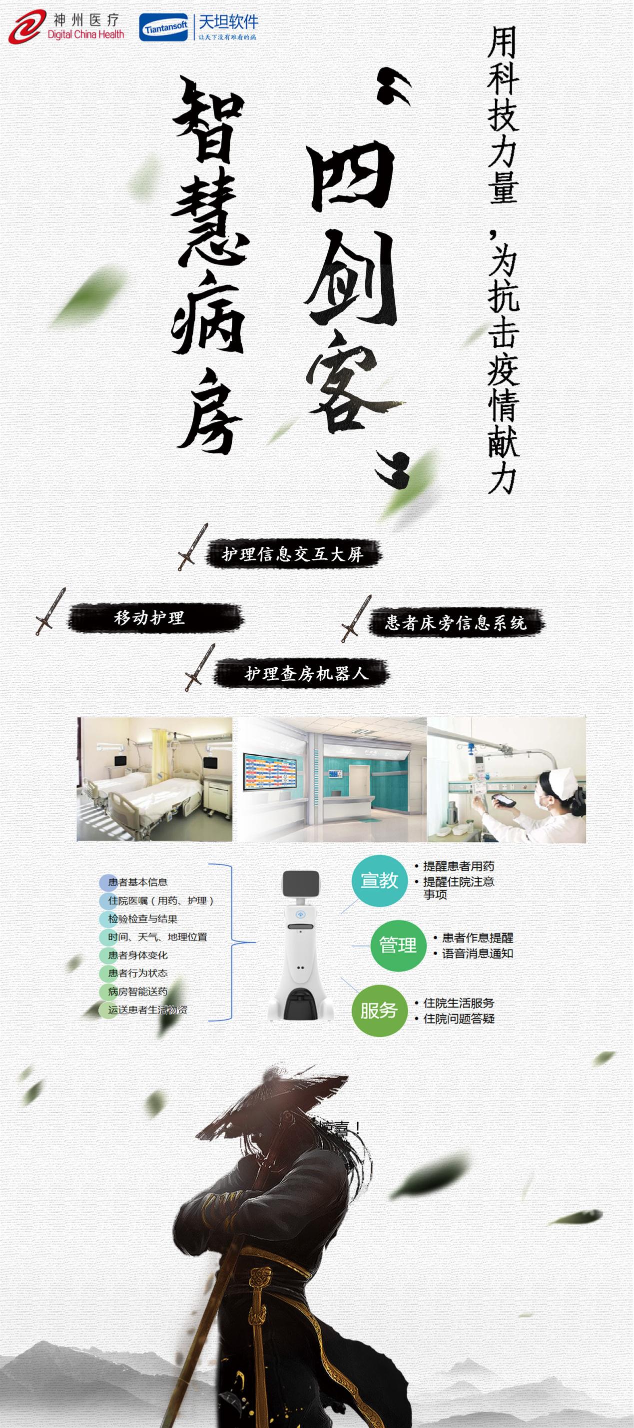 神州天坦智慧病房"四劍客",是神舟天坦憑借著十余年在醫(yī)療衛(wèi)生領(lǐng)域中豐富的行業(yè)經(jīng)驗(yàn)積累,并針對此次新冠疫情防治的一線醫(yī)護(hù)人員日常工作需求,優(yōu)選出的可以快速搭建、臨床實(shí)用性高的智慧病房四大子系統(tǒng),具有很強(qiáng)的建設(shè)價值。以軟硬件、物聯(lián)網(wǎng)和人工智能技術(shù),構(gòu)筑起防治新型冠狀病毒的信息化關(guān)口,為醫(yī)護(hù)人員診療工作、患者住院服務(wù)進(jìn)行保駕護(hù)航。以科技的力量為抗擊疫情獻(xiàn)力,我們一起攜手同行、共克時艱。贏得這場沒有硝煙的戰(zhàn)“疫”,中國加油!戰(zhàn)“疫”必勝!