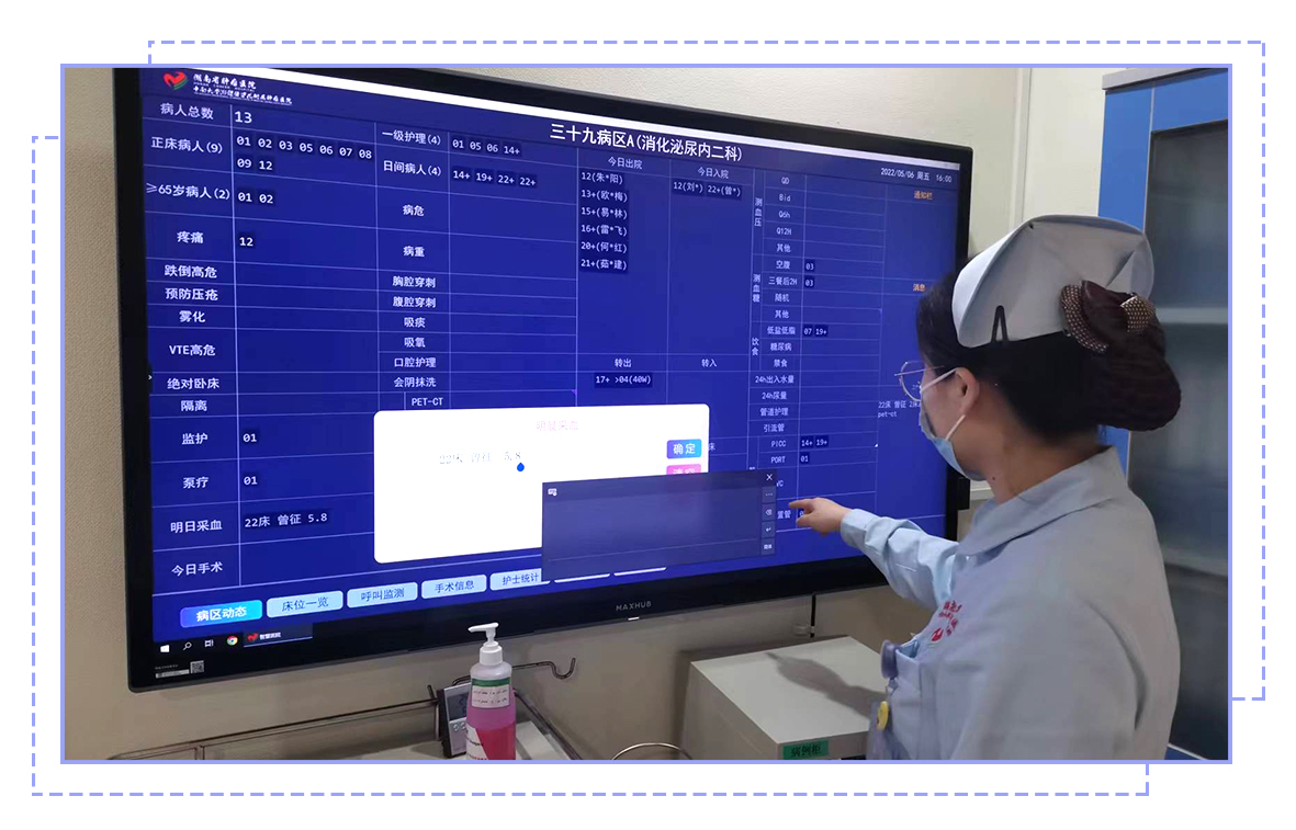 智能交互大屏作為整個病區(qū)的中心,展示病區(qū)所有患者信息的護(hù)理信息,代替了傳統(tǒng)的白板記錄,并且可以查看病區(qū)患者簡卡及患者動態(tài),對病區(qū)內(nèi)需手術(shù)患者信息展示、護(hù)士交接班信息展示,使管理人員可以做到心中有數(shù),合理分配工作,還可對病區(qū)數(shù)據(jù)統(tǒng)計(jì),如患者呼叫統(tǒng)計(jì)、護(hù)士信息統(tǒng)計(jì)、值班動態(tài)統(tǒng)計(jì),從而建立一個有序的醫(yī)療環(huán)境。