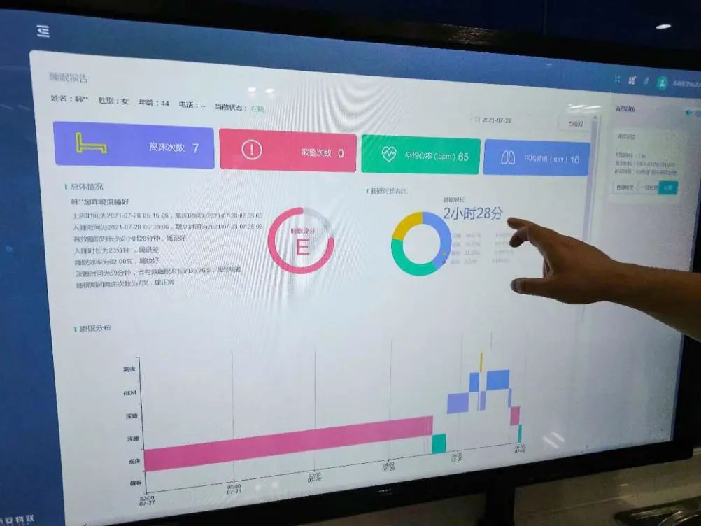 除了輸液外,患者的生命體征和運動軌跡也是醫(yī)護人員需要時刻操心的問題。智慧病房搭建智能在床實時監(jiān)測系統(tǒng),在床墊下放置了傳感器,可以精準測量和傳輸患者的生命體征、睡眠、離床等數(shù)據(jù),一旦數(shù)據(jù)異?;蛘呋颊唛L時間不在監(jiān)測范圍內,系統(tǒng)會自動進行異?;螂x床、跌落等警報,可以及時避免意外事件發(fā)生。
